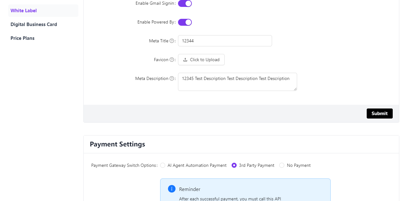 Navigate through White Label->Payment Settings
